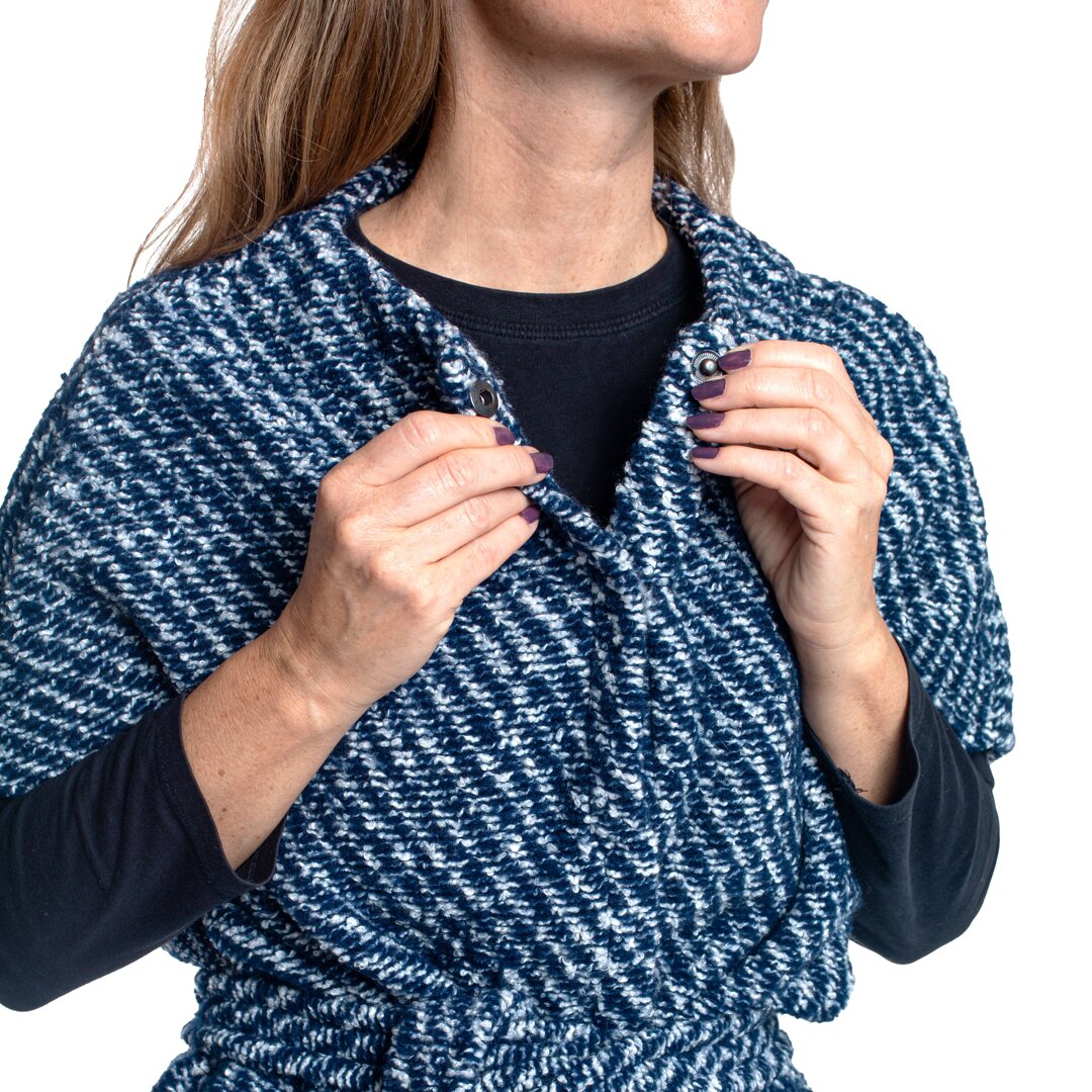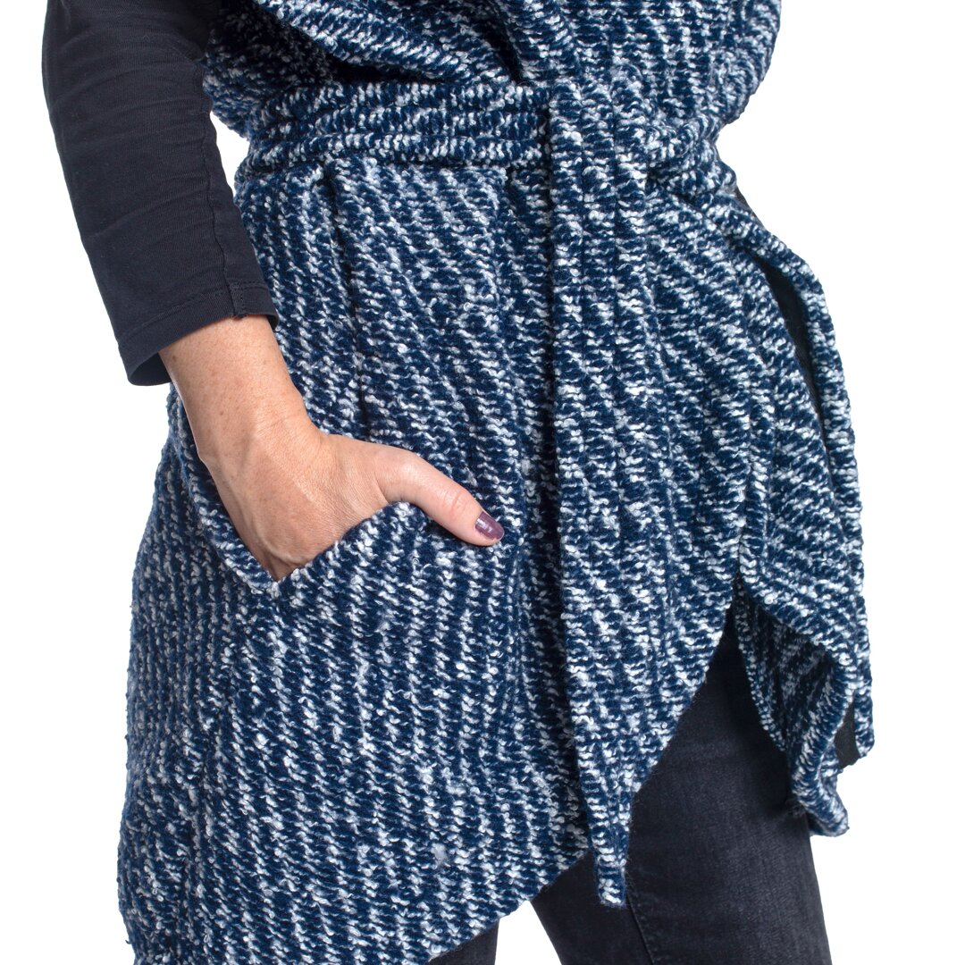 O vestă elegantă de damă cu o croială neobișnuită va impresiona nu numai prin aspectul său netradițional, ci și prin materialul fin și moale din lână de oaie. Combinația de prindere cu capse și o curea permite ca vesta să fie purtată în mai multe feluri.